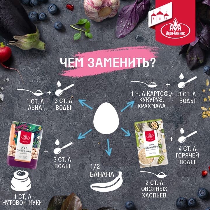 Часто из-за аллергии или во время поста мы сталкиваемся с проблемой исключения яиц из выпечки. Это ведь не просто ингредиент. ☝🏻Яйца выполняют одну из главных ролей — связывают все компоненты в единое целое. Предлагаем несколько вариантов, чем заменить яйцо. Все представленные ниже ингредиенты заменяют 1 яйцо: 📌 1 ст.л. измельченного льна + 3 ст.л. воды 📌 1 ст.л. нутовой муки + 3 ст.л. воды 📌 1 ч.л. картофельного/кукурузного крахмала + 3 ст.л. воды 📌 1 ст.л. порошка агар-агара + 1 ст.л. воды 📌 Половина банана 📌 2 ст.л. мелких овсяных хлопьев, залить 4 ст.л. горячей воды, дать впитаться 📌 1/4 стак. яблочного пюре 📌 3 ст.л. арахисовой пасты ⚠ Важно: предложенные сухие ингредиенты, прежде чем добавить в тесто, необходимо развести водой до состояния густой сметаны, поэтому не добавляйте сразу всю жидкость!Постепенно доводите смесь до нужной консистенции. Имейте в виду, что данная замена яйца выполняют роль именно связующего компонента, выпечка с яйцом, все же, получается воздушне
