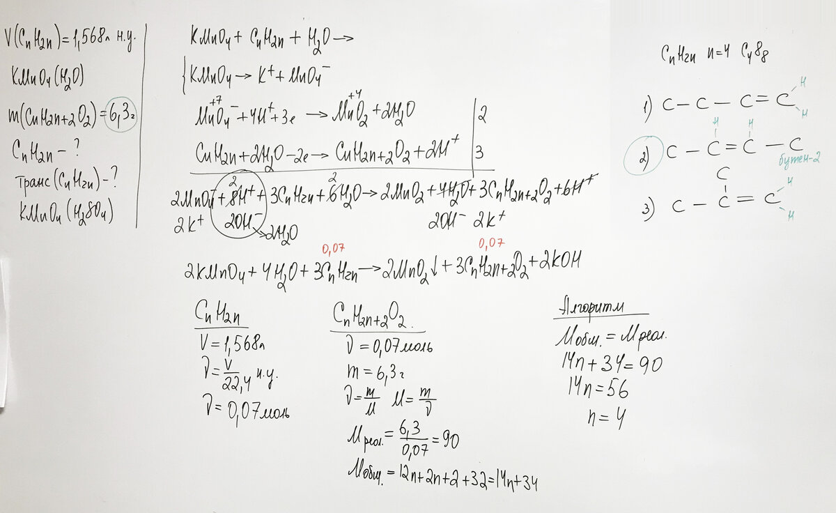 Смесь цис- и транс-изомеров алкена общим объемом 1,568 л (н. у.) пропустили через избыток водного раствора перманганата калия. Масса образовавшегося органического продукта составила 6,30 г. Установите молекулярную формулу углеводорода, изобразите структурную формулу транс-изомера и напишите уравнение его реакции с подкисленным раствором перманганата калия.