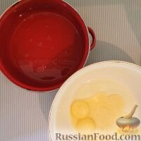 4 яйца разделить на белки и желтки, одно яйцо целиком разбить в желтки. Желтки взбить с сахаром и ванилином. Добавить к желткам растопленное масло и снова взбить. Постепенно вводить муку, взбивая. Добавить теплое молоко, хорошо размешать. Белки хорошо взбить в стойкую пену, до устойчивых пиков. Добавить белки к тесту, аккуратно венчиком перемешать. Да, будет жидко, не пугайтесь. Форму смазать растительным маслом, вылить в нее тесто.