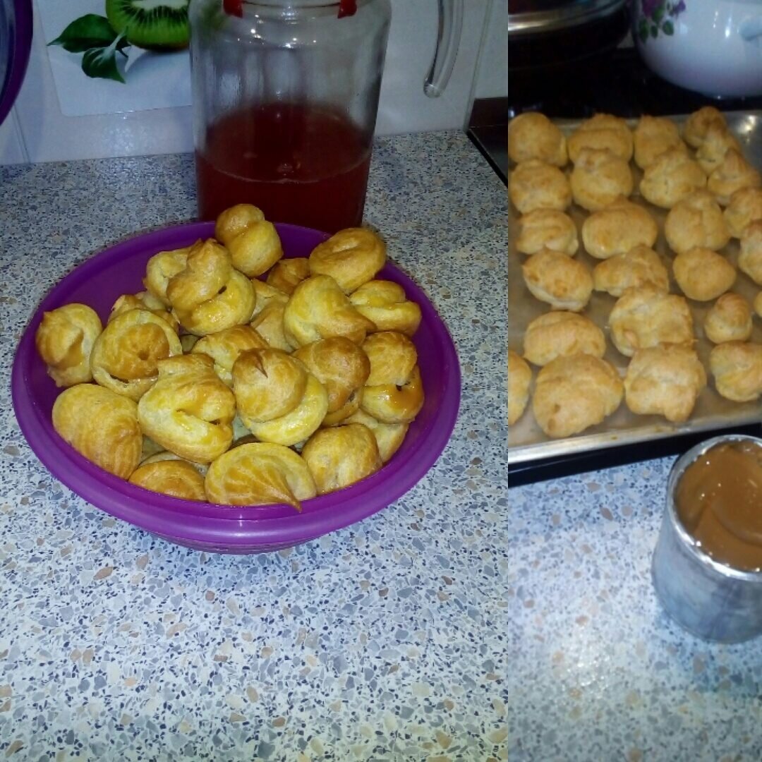 Я взяла небольшую кастрюлю, влила туда воду и добавила сливочное масло, немного соли. Довела до кипения и добавила муку, тщательно помешивая, чтобы не было комочков. На огне подержала еще 2 минуты. Главное, чтобы не пригорало! Сняв полученную массу с огня, я быстро добавила в нее все яйца. После добавления каждого яйца нужно тщательно, но недолго вымешивать смесь. В итоге масса должна получиться однородной.