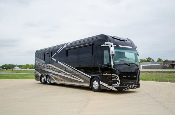 Дом на колёсах получил практичный кузов с привлекательными ксеноновыми противотуманными фарами, попасть же в него можно без ключа. Также RV оснащён тремя телевизорами, самый большой из которых — 55-дюймовый LG 4K UHD — находится в главной спальне, которая настолько просторна, что в ней даже смогли разместить кровать размера «king-size» с двумя но