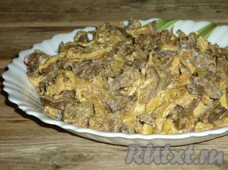 Вкусный, сытный салат с печенью и яичными блинчиками готов. Охладить и можно подавать на стол.