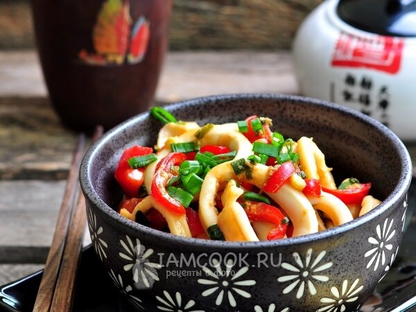 Очень простое блюдо из кальмаров в китайском стиле, которое можно приготовить за считанные минуты. Кальмарчики получаются очень вкусными и питательными, подавать их можно без гарнира.