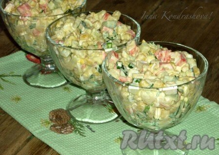 майонез. Перед подачей крабовый салат с картошкой и кукурузой охладить, разложить по салатницам и подать на стол.