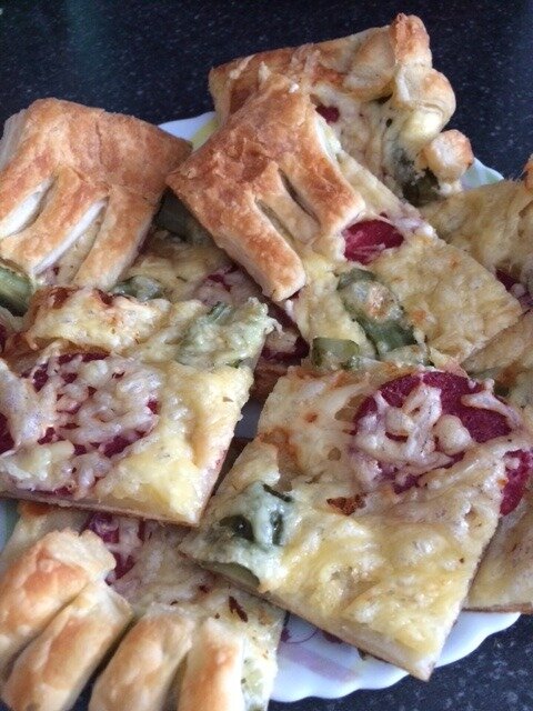 Тонкая, хрустящая, что еще от пиццы можно потребовать? Слоёное тесто раскатываю до толщины 0,4-0,5 см, а дольше всё как и все: чем нибудь смазываем, что-нибудь сверху набрасываем и всё это посыпаем сыром. Такая пицца выпекается 10-15 минут на 2 уровне при 220 градусах.