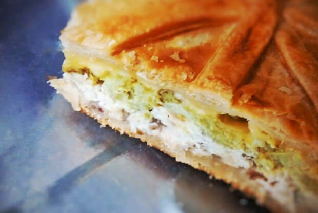 4. Поставить пирог в духовку (200 градусов) и оставить минут на 10. Затем достать, смазать оставшимся яйцом пирог и поставить обратно в духовку. Выпекать еще минут 10–15 до появления золотистой корочки.