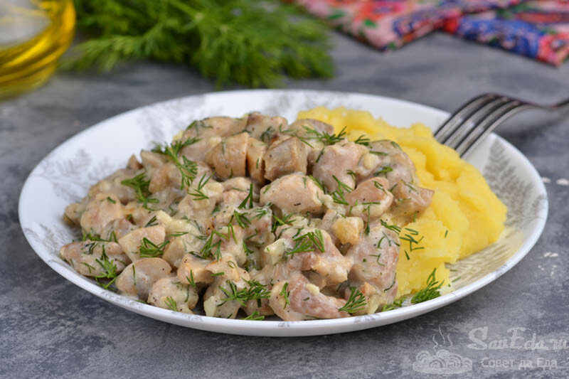 Куриное филе нарезать небольшими кубиками и обжарить на растительном масле на сильном огне до оранжевой корочки. Лук мелко шинкуем и обжариваем его отдельно от курицы на оливковом масле до золотистого цвета, затем добавляем мелко нарезанные грибы. После того как объём грибов слегка уменьшился, добавляем перец и соль. Жарим всё это в течение 10 минут на среднем огне и затем добавляем сметану, перец горошком, лавровый лист и нашинкованный укроп. Убавляем огонь и жарим ещё примерно 2 минуты, после чего смешиваем получившуюся массу с курицей, тщательно перемешиваем, накрываем крышкой и готовим на слабом огне ещё 5 минут. Блюдо готово. Источник фото Ингредиенты: Приятного аппетита!