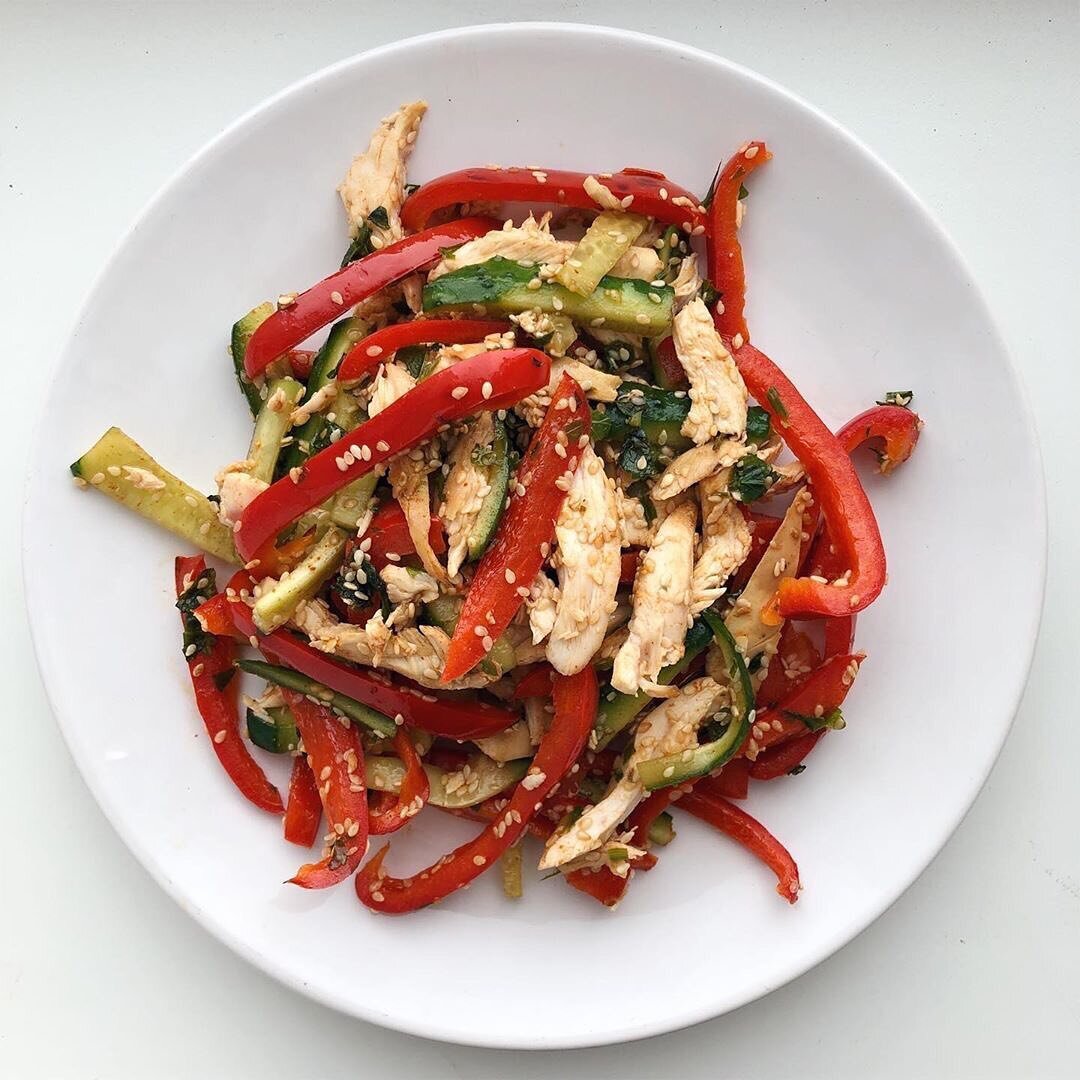 1. Соломкой режем огурец, добавляем специи и соевый соус, перемешиваем и отставляем в сторону. 2. Разогреваем сковороду. На сухую сковороду кладем ложку кунжута и минутку обжариваем, далее добавляем ложку масла и нарезанный полосками болгарский перец. Обжариваем на небольшом огне чтобы перец стал мягким. 3. Далее добавляем порезанную полосками грудку и зелень. Добавляем к огурцам, перемешиваем и готово! Приятного аппетита!