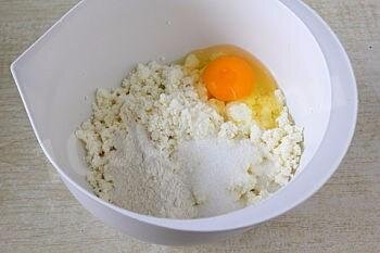 - ● ШАГ 1: В творог добавить сахар, соль, ванилин, размять вилкой / чтобы не было крупных комков /. Добавить 3-4 ст.л. муки, перемешать. Потом добавить яйцо и ещё раз хорошо перемешать. А можно сразу одномоментно смешать все ингредиенты, кому как нравится.