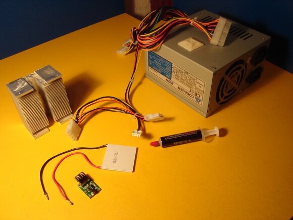 Основой является элемент Пельтье. Это термоэлектрический модуль, используемый в кулерах для воды и переносных холодильниках, так же его применяют для охлаждения процессора. При подаче на него напряжения, одна сторона охлаждается, а другая нагревается. Мы же наоборот будем греть одну сторону, чтобы получить электричество.