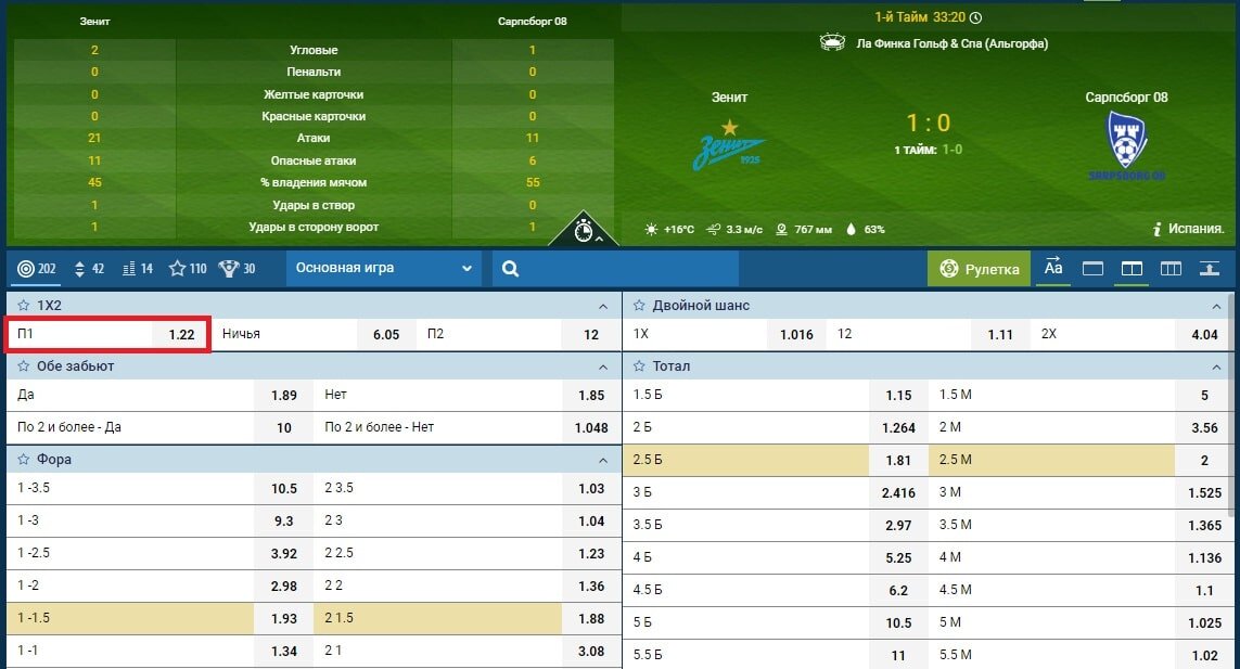 Стратегия с минимальным риском «Флэт» Базируется эта стратегия на методе одинакового и неизменного размера пари. От меня требуется совершать пари постоянно на аналогичную сумму, независимо от исходов и кэфов. Я самостоятельно выбираю сумму ставки, но при этом учитываю имеющийся банкролл. Размер составляет определенную долю банкролла, выраженную в процентах, например 1 или 3 процента. Приведу пример. Допустим, размер моего банка составляет 150 долларов. Сумма одной моей ставки равна 5% — это 7.5 долларов. Я совершаю прогноз на хоккейный поединок «Зенит» — «Сарпсборг». Выбираю исход П1 с кэфом 1.22.