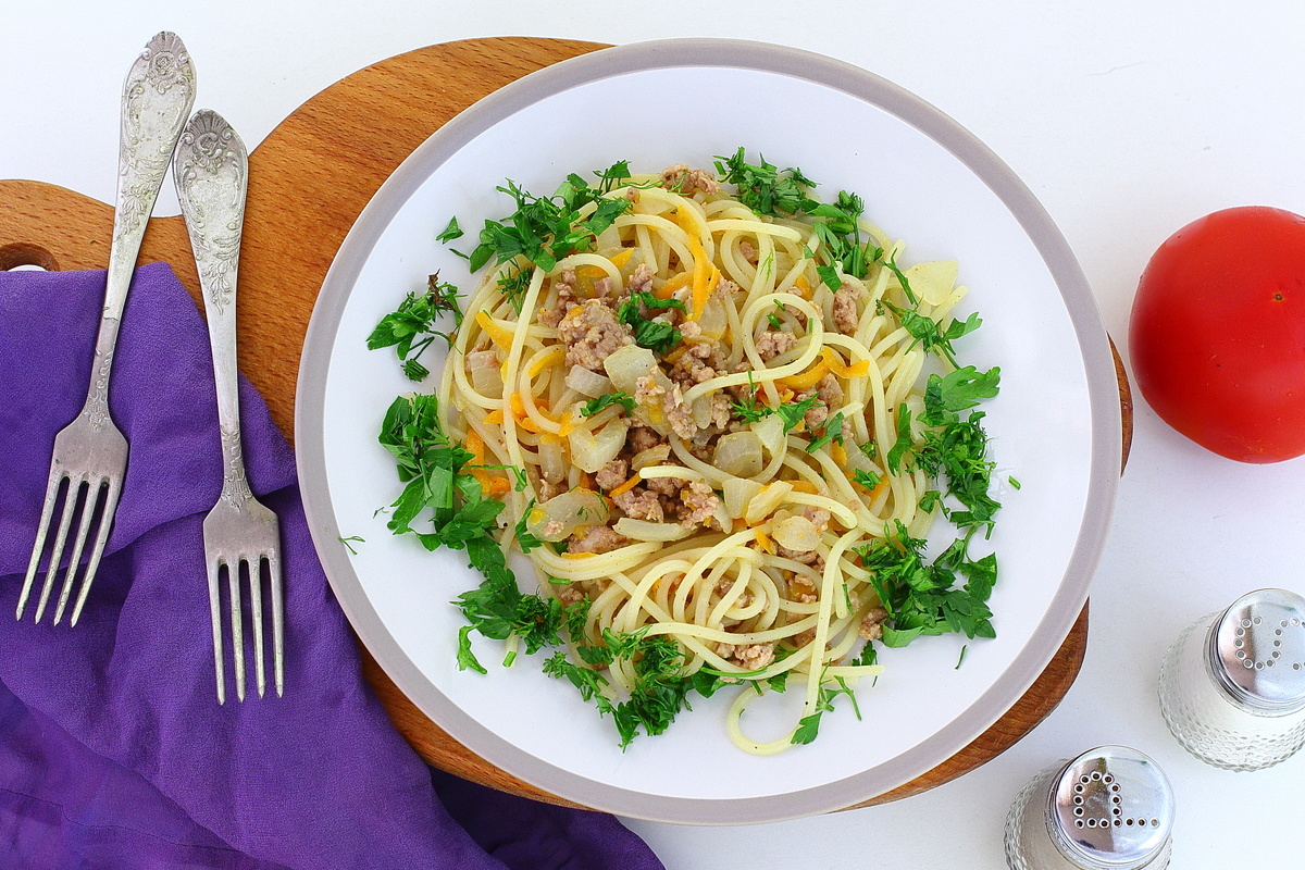 Хрюкает в грязной лужице розовощекий малый. Где-то свинина тушится, где-то вкушают сало. Вянет на кухне руккола, бьёт мясорубка маршем: То, что когда-то хрюкало, ляжет в тарелку фаршем. Длинная макаронина - это не только тощая блондинка на каблуках, но ещё и изделие из теста, которое вы можете обнаружить в пачке спагетти. Вы же помните, что настоящие спагетти имеют длину более 13 см и диаметр 2 мм. Спагеттини и спагеттони соответственно - более худые и более толстые макаронины той же длины. Если на первое у вас был низкокалорийный суп, горячее блюдо должно быть сытным и вкусным. Накормишка предлагает приготовить спагетти с мясным фаршем на сковороде. Состав: свинина — 300 г; спагетти — 200 г; луковица — 1 шт.; морковь — 1 шт.; зелень — 1/2 пучка ; чеснок — 1 зубчик; растительное масло — 3 ст. л.; соль, перец — по вкусу; молотый кориандр — 1/4 ч. л. (опционально); сухая аджика — 1/4 ч. л. (опционально). Приготовление: 1. Сделайте зажарку. Измельчите лук и морковь. Разогрейте масло в