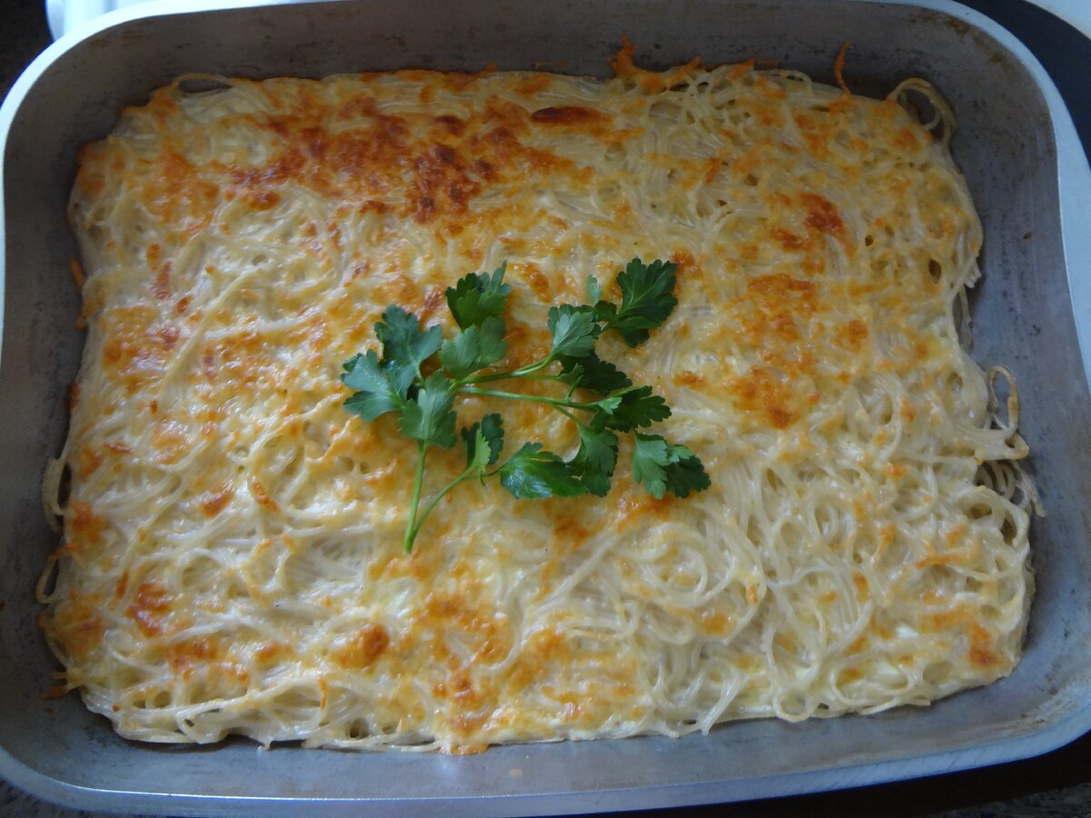 Этот вариант приготовления спагетти очень интересный, вкусный, быстрый и приносит разнообразие в приготовление пасты. Мне очень нравится запеканка в остывшем виде, когда чувствуется хорошо вкус сыра. Прекрасный вариант для семейного ужина. Беру спагетти, сыр и готовлю вкусную запеканку. Сначала я отвариваю спагетти. Взбиваю в кастрюле яйца со сметаной. Сыр натру на крупной терке. 3 столовые ложки оставлю для посыпки, а остальной сыр добавлю в кастрюлю, еще немного соли и взбиваю. Форму для запекания смазываю растительным маслом и высыпаю спагетти. Заливаю их яично-сметанной смесью. И сверху посыпаю сыром. Отправляю в духовку на 25 минут и выпекаю при температуре - 200 градусов. Запеканку немного остужаю перед подачей, тогда будет чувствоваться вкус сыра. Подаю с зеленью. Этот лакомый кусочек остывший можно, как пиццу, есть руками. Если вам было полезно и понравился рецепт, поставьте лайк. Подпишитесь на канал, вам может быть пригодится понравившийся рецепт, и мне будет приятно, быть