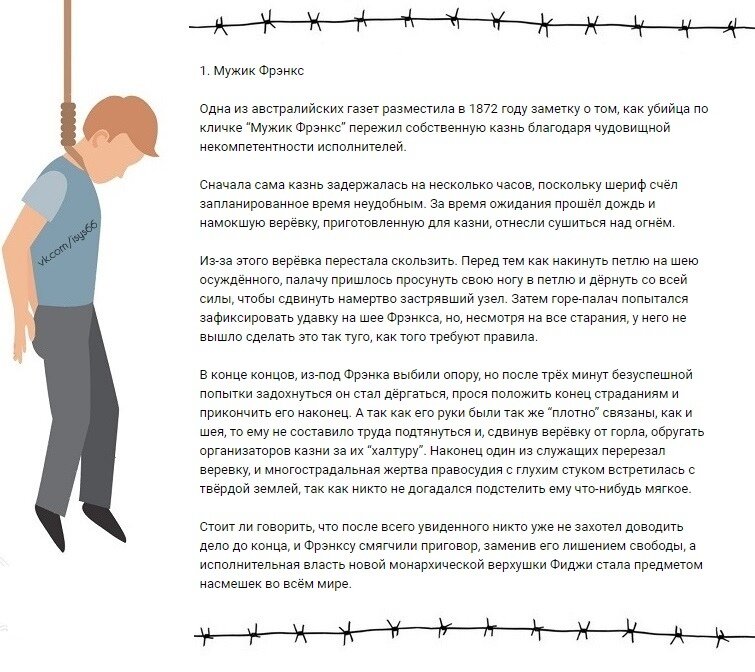 В прошлом сам факт, что преступнику удалось остаться в живых после исполнения высшей меры наказания рассматривался не иначе как Божье провидение, то есть считался доказательством невиновности, посланным свыше. Ниже приведены шесть реальных историй о людях, которые смогли остаться в живых вопреки закону, пусть даже совсем ненадолго.
