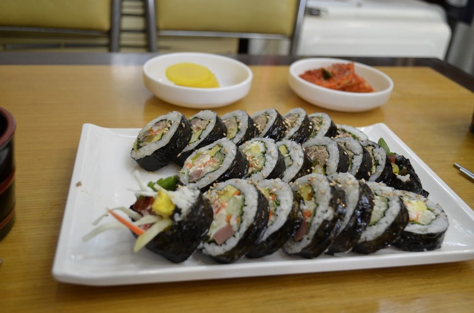С самых первых дней в Корее , как любой любитель роллов , я прониклась глубокой любовью к кимбабу. В первую поездку, так как читать по корейски я не умела , а бабушки в традиционных ресторанах не понимали по- английски , приходилось довольствоваться кимбабом из минимаркета CU или GS25. Во вторую поезду ситуация была уже лучше и я отправилась в ресторан. В традиционном ресторане кимбаб подают с маринованой редькой , кимчхи и мисо супом. Стоимость 4000 вон~ 220 рублей. Когда вернулась в Россию , где-то через месяцев шесть ностальгия всё же настигла и решила я посетить новенький корейский ресторан. Стоит уточнить, что живу я в не большом городе, хоть он и считается столицей края, но до главной столицы ему ещё очень далеко. Ресторан был в целом чистый и приятный , настроение даже не омрачил повар- казах , искусно строящий из себя кпоп- айдола. И даже то, что во время работы при клиентах он сбегал покурить и вернувшись с сигаретным амбре , подошёл к нам уточнить все ли нравится. А