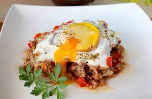 Ингредиенты: -Фарш мясной – 300 г говядина и свинина. -Яйцо куриное – 3 шт. -Перец болгарский – 70 г. -Лук репчатый – 100 г. -Помидор – 100 г -Бульон – 70 г или вода. -Масло растительное – 2 ст.л. -Приправа – по вкусу -Соль – по вкусу -Перец черный – по вкусу Приготовление: Сладкий перец можно взять как красный, так и желтый. Зеленый горьковат, но если это вас не пугает, то берите любой. Состав приправ у меня всегда один и тот же. Поскольку этот рецепт приготовлен по мотивам турецкой кухни, то я всегда беру по щепотке зиры, кориандра, розмарина и тимьяна. Щепотка не маленькая, примерно 1\3 чайной ложки каждой приправы. Лук очистить от шелухи и порезать мелким кубиком. Из перца удалить белые мембраны и семена и тоже порезать кубиком. С помидора желательно, но не обязательно снять кожу и мелко порезать. Для того,что бы кожа снялась очень просто, томаты залить кипятком и подержать в нем секунд 30. После слить и залить холодной водой. Затем достать и снять кожицу. Начать обжар