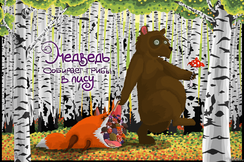 Медведь собирает грибы в лису