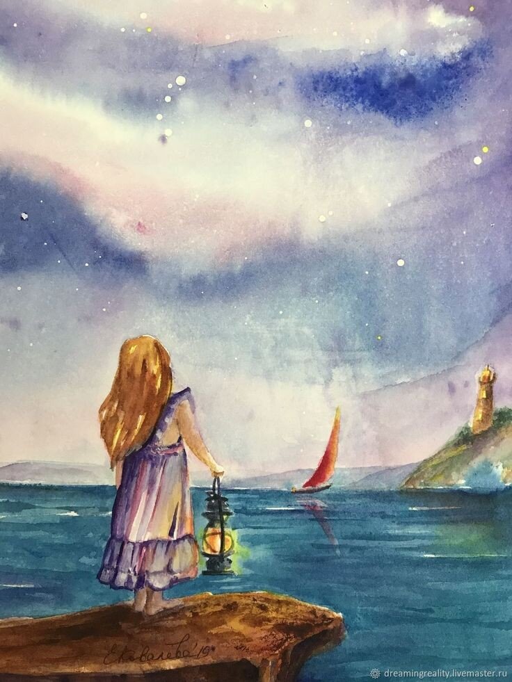 "Чудеса нужно делать своими руками" Я посмотрела ее впервые за много лет. Сказку, про девушку Ассоль, у которой исполнилась мечта. Точнее, ее исполнил принц. Тут я задумалась, а что если бы принц так и не приплыл? Идут годы.. Горожане по-прежнему ехидничают и шепчутся за спиной. Ассоль также делает деревянные игрушки, время от времени оценивая взглядом горизонт и свое отражение в зеркале. И вот ей 30. Тогда, она принимает решение больше не ждать у моря погоды и действует. Она складывает игрушки в деревянный ящик, садиться на корабль и отправляется в плавание. Игрушки в заморских странах разлетаются, словно горячие бутерброды (ручная работа как никак). И где-то на другом конце земли Ассоль встречает свою любовь. Возможно даже принца, которому она открывает свою мечту. Затем, они вместе выбирают шелк и на алых парусах возвращаются в ее родной город. Народ в шоке. Сказка стала явью. А секрет в том, что мечта Ассоль стала ее целью. Чтобы достигнуть цели она: Верить, мечтать, уметь ждать-