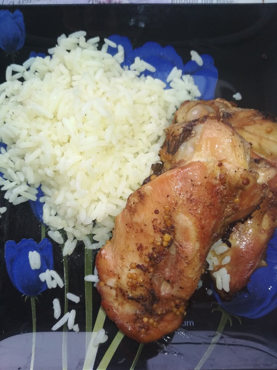 Сегодня ужин без заморочек, не было особо времени, а в этом рецепте его много и не требуется. Поэтому встречаем курочку в медово-горчичном маринаде. Ингредиенты: Курица (у меня в этот раз бедра)-800грамм Мед (жидкий)-2ст.ложки Зерновая горчица-2ч.ложки Соевый соус-4ст.ложки Паприка-2ч.ложки Перец по вкусу Приготовление: Курица готова, подавать с любым гарниром, у меня в этот раз был рис. Я его отварила и обжарила в сливочном масле. Если Вам понравился рецепт поставьте пожалуйста класс, а если решили попробовать напишите пару слов! Спасибо, мне очень приятно!