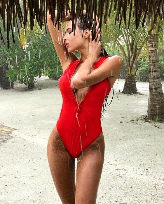 Но больше всего жена Тимати выделилась в другом фото. Она выложила фото фото в красном купальнике с пляжа.Модель стоит под дождем