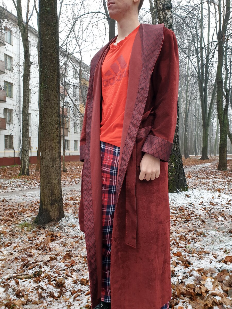 ⠀Курительный или сигарный халат - за такие шикарные вещи обожаю ретро. Ну разве в наше время кто-то надевает халат, который скорее больше похож на пиджак, дома? Пуаро в таком часто появляется на экране. Обожаю этот фильм уже только за стиль Эркюля. Ну и на ком тренироваться как ни на муже? Это были одни из первых моих пошивушек. Были и косяки, но в целом очень даже хорошо вышло. Из ошибок: не учла ширину полотна на халат, пришлось все кроить прям тютелька в тютельку. Много мучила рукава, доводя их до идеальной посадки, не учитывая, что изначально брала другую концепцию. Но закрытые ручные швы в манжетах - это моя гордость. Хотя сейчас не стала бы так париться ⠀ В штанах было все прекрасно, за исключением ткани в магазине. Состав был неплох, цена приличная, но... это все начало покрываться катышками! от них было не избавиться, что доводило меня до белого коления. На складе нашла похожую ткань, но чистый хлопок. Дёшево и качественно. Выкройка очень проста в построении, но случайно ее в
