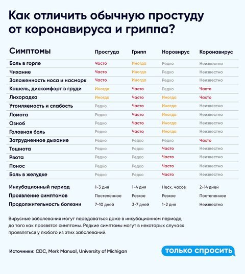 Новый коронавирус попадает в организм через слизистые (дыхательных путей, конъюнктивы глаз, и так далее), впрочем, как и все другие респираторные вирусы, включая грипп. По данным ВОЗ чаще всего заболевание начинается со слабости и недомогания, повышения температуры и сухого кашля. У некоторых людей могут отмечаться боли и ломота в мышцах и суставах, заложенность носа, насморк, фарингит или диарея. Чаще всего, эти симптомы развиваются постепенно и проявляются довольно слабо. До 80% случаев заболеваний протекают легко, сопровождаясь лишь легким недомоганием и невысокой температурой. У некоторых инфицированных людей вообще не возникает каких-либо симптомов или плохого самочувствия. В отличии от многих других респираторных вирусов, коронавирус чаще атакует нижние дыхательные пути — бронхи и легкие, вызывая пневмонию и дыхательную недостаточность, которая и является причиной смерти у пациентов из группы риска (пожилой возраст, хронические сопутствующие заболевания). Поэтому при усугублени