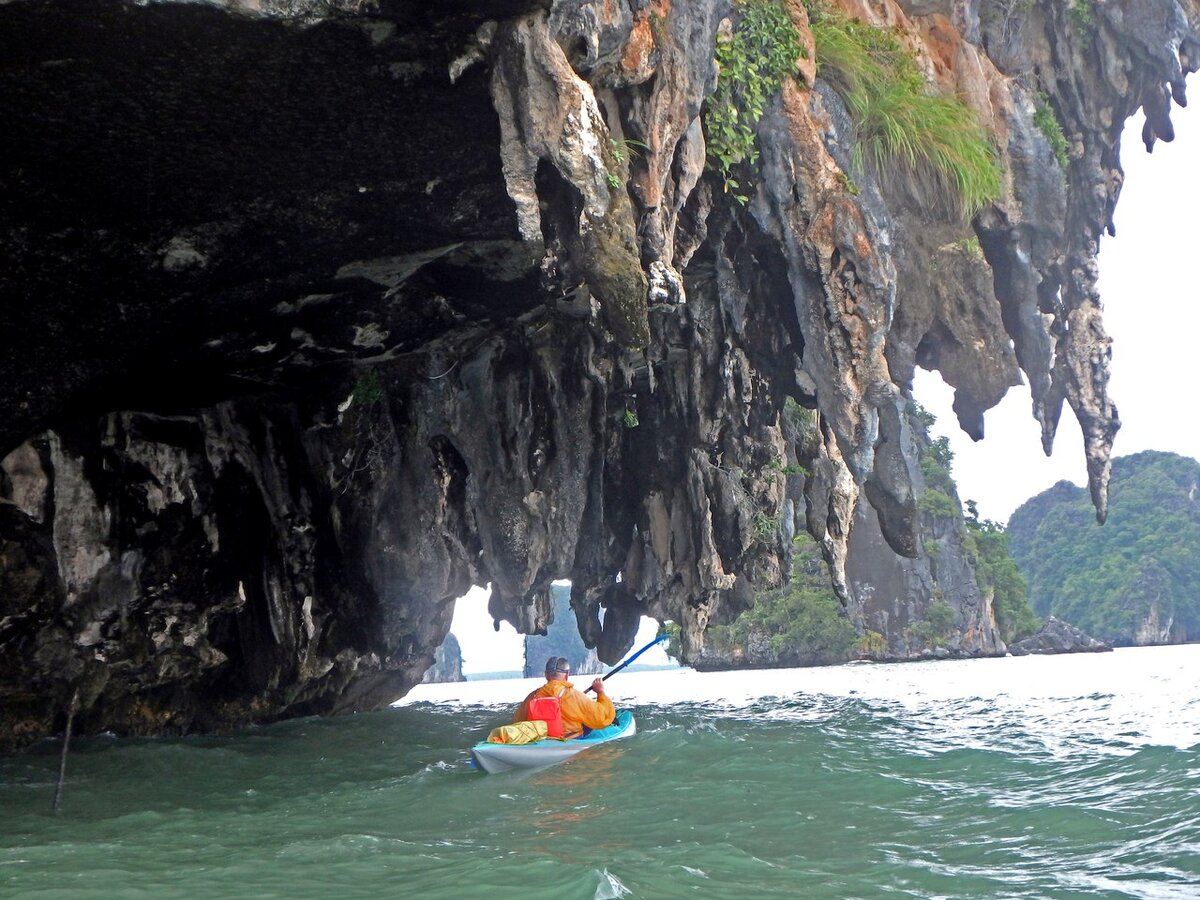 Случилось это несколько лет назад в заливе Пханг-Нга, что в Андаманском море, бассейна Индийского океана. Когда планировали маршрут, я рассматривал всё не только по картам, но и по спутниковым фото, так как для прокладки маршрута от стоянки к стоянке нужно понять, где ночевать. Там везде вертикальные скалы или заросли мангровых деревьев. Где вставать - непонятно. А со спутника очень хорошо видны пляжи. Вот на эти пляжи я сдуру и ориентировался. У нас, конечно, был с собой график приливов на сроки нашего похода, но помогло это только частично.