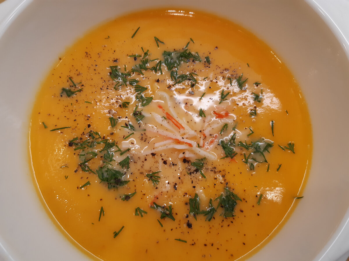 Доброго времени суток, дорогие читатели! Сегодня приготовим вкусный и яркий крем-суп из тыквы. Оранжевый цвет подарит отличное настроение и зарядит энергией. А нежный, слегка сливочный вкус оценит каждый гурман. Продукты (на 3-4 порции): Приготовление 1. Тыкву и морковь нарезать кубиками, добавит 400-450мл воды, посолить и отварить до готовности. Снять с плиты и остудить. Внимание: бульон не сливать! 2. Затем пюрировать блендером, влить сливки, поставить на огонь. Довести до кипения, но не кипятить, а сразу снять. 3. Крабовые палочки нарезать тонкой соломкой или разобрать на волокна. Должны получиться тонкие нити длиной 3 - 4 сантиметра. Подача Наливаем суп в тарелку, в середину выкладываем крабовую соломку, добавляем нарезанный укроп и черный молотый перец. Приятного аппетита! Готовьте вкусно и красиво для себя и своих близких. Радуйте их новыми блюдами как можно чаще. А интересные рецепты вы найдете на моем канале https://zen.yandex.ru/profile/editor/id/5e50a180b38ee002b5fc2e7d Подп