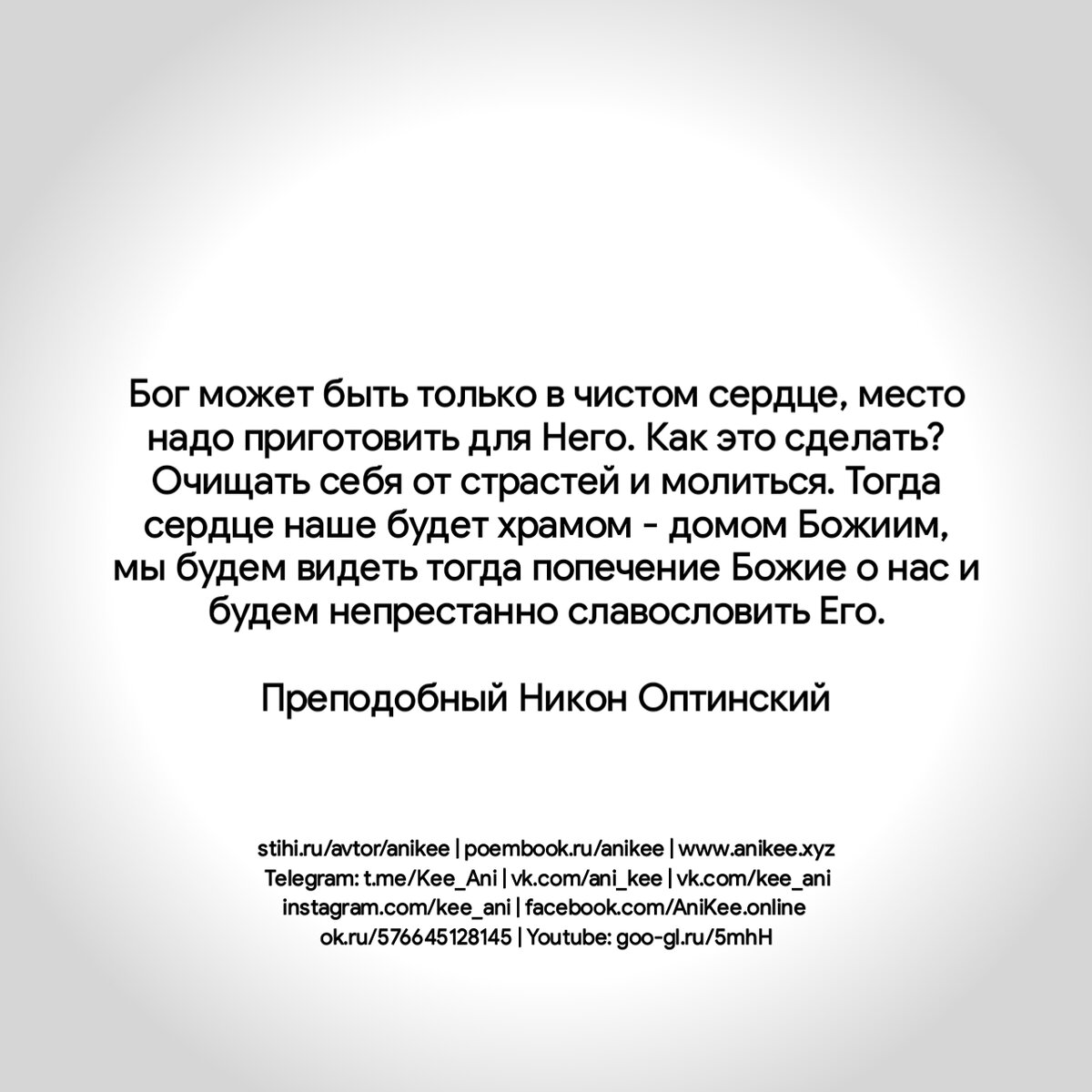 Бог может быть только в чистом сердце, место надо приготовить для Него. Как это сделать? Очищать себя от страстей и молиться. Тогда сердце наше будет храмом - домом Божиим, мы будем видеть тогда попечение Божие о нас и будем непрестанно славословить Его. Преподобный Никон Оптинский #никоноптинский #цитатысвятыхотцов #цитатырелигия #цитатыобоге #просветление