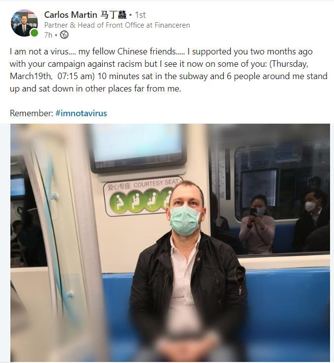А сегодня вот это фото, где иностранец выложил свою поездку в метро и написал, что от него отсели все китайцы, потому что он иностранец. Он пишет, что он их недавно поддерживал, и из Китая никуда не выезжал. И он спрашивает - что же случилось сейчас с китайцами? И он пишет "я не вирус".
