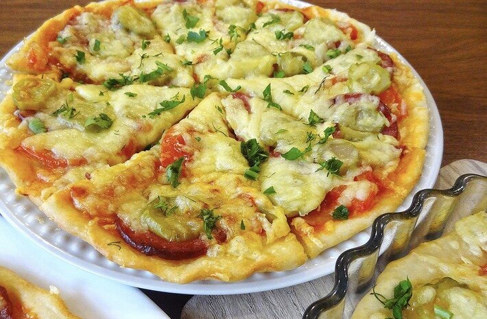 Отличное тесто для мягкой и тонкой пиццы можно приготовить без дрожжей, молока, кефира и сметаны и всего за пару минут! Этот рецепт из разряда палочек-выручалочек. Ингредиенты для «Экономное тесто для пиццы "Молния"»: Время приготовления: 2 минут Количество порций: 12 Рецепт «Экономное тесто для пиццы "Молния"»: 1. К просеянной муке добавляем соль, сахар и разрыхлитель. Перемешиваем. 2. В центре делаем углубление. В него отправляем яйцо и воду. Замешиваем тесто сначала ложкой. Как только мука впитает всю влагу, добавляем 2 ст. л. растительного или оливкового масла. После этого с полминуты вымешиваем тесто руками. Оно получается довольно липким, но муки больше не подсыпаем. Добавим ещё 1 ст. л. растительного масла и слегка обомнем тесто, помогая маслу распределить по всей поверхности. Буквально несколько движений и все! Тесто готово! Из теста по данному рецепту выходит 3 пиццы диаметром 28 см. Начинку можно делать любую. Приятного аппетита !