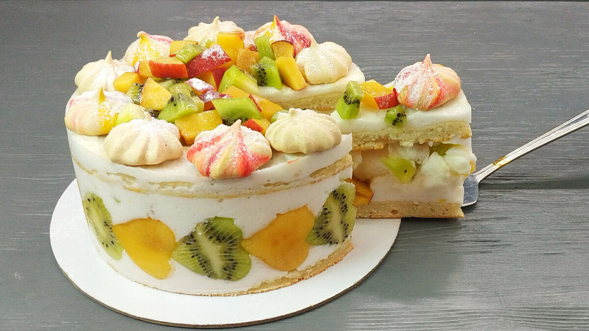 За окном уже вовсю чувствуется весна и поэтому захотелось чего-то яркого и нежного. Сегодня у меня легкий постный торт из миндальных коржей, воздушного суфле и фруктов. Такой десерт порадует и тех, кто следит за своей фигурой. КБЖУ на 100 г десерта: 144/4/8/14.