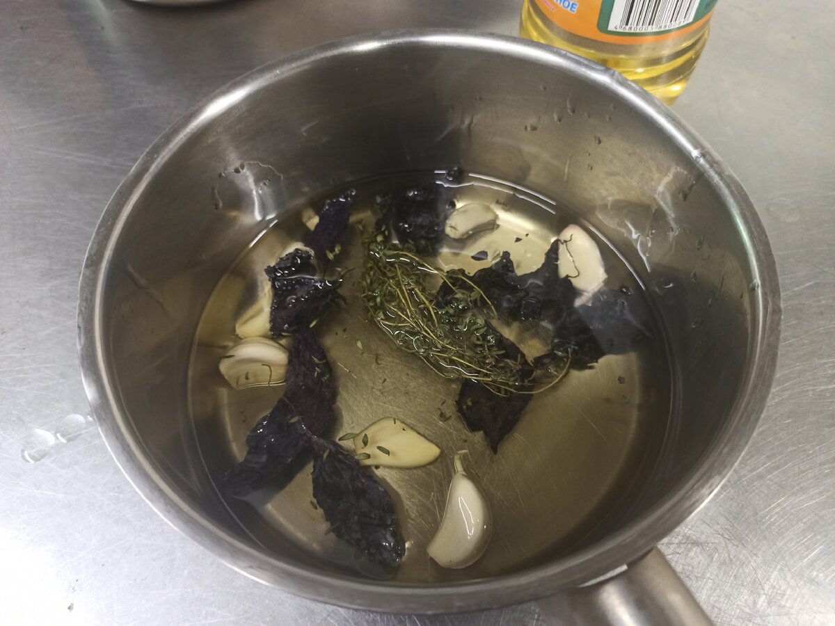 Почистите головку чеснока и положите а сотейнике с растительном маслом, туда же добавьте любые ароматные травы( розмарин, тимьян, базилик). Доведите масло до кипения.