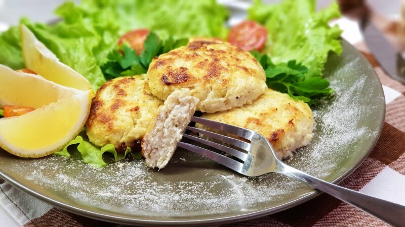 Рыбные котлетки с творожным сыром На 100гр: ккал - 135.2, Б - 13.7, Ж - 8.3, У - 1.2. Ингредиенты (~ на 5 порций): филе трески - 700 гр.; творожный сыр ("Almette" сливочный) - 100 гр.; яйца куриные - 2 шт.; лук белый репчатый - 1 шт.; масло подсолнечное - 50 гр.; лимонный сок - 1 ст. л; специи для рыбы - 2 ч. л.; перец белый, соль - по вкусу. Приготовление: 1) Лук очистить, мелко порезать, жарить на сковороде на сливочном масле до золотистого цвета, затем поставить остывать в прохладное место. 2) Треску промыть, промокнуть бумажным полотенцем, перемолоть в блендере или прокрутить в мясорубке. 3) Яйца и творожный сыр взбить блендером или вилкой. 4) Рыбный фарш соединить с яйцами и луком, сбрызнуть лимонным соком, посолить, поперчить белым перцем и приправить специями для рыбы. Все ингредиенты тщательно перемешать. 5) Влажными руками вылепить котлетки, обжарить в сковороде на подсолнечном масле на среднем огне до готовности. Затем сложить все котлеты в сковороду (у меня вышло 16 штук)