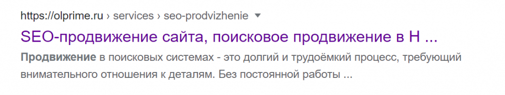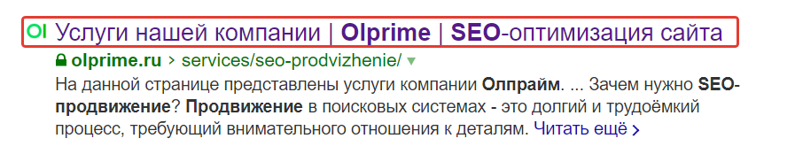 Но не всегда. Как и с title, у Google и Яндекс может быть своё мнение на то, что будет полезным для пользователя. В этом случае, в description прописано только «На данной странице представлены услуги компании Олпрайм». Яндекс взял описание и добавил релевантные фразы из текста. А Google решил не показывать description.