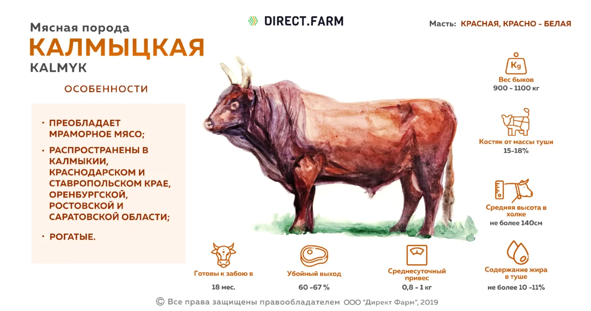 Одна из древнейших пород КРС на территории нашей страны – калмыцкая порода коров, которая по праву считается к настоящему дню лучшей из отечественных пород мясного направления. На формирование уникальной породы, выведенной когда-то племенами кочевников калмыков, обитавших в достаточно жёстких условиях степных и горных районов Центральной и Средней Азии и Китая, значительное влияние оказали, как условия обитания (неблагоприятные климатические условия и круглогодичное пастбищное содержание скота), так и образ жизни самих кочевников. При этом продолжительное время одним из ключевых факторов формирования и поддерживания положительных хозяйственных качеств калмыцкой породы являлся жёсткий естественный отбор. Характеристика КРС На территории России порода получила распространение не менее 400 лет тому назад на землях от Сибири до Поволжья и донских берегов. Значительное долголетие, гармоничность сложения, выносливость, достаточно крепкая конституция – отличают КРС калмыцкой породы. Коровы
