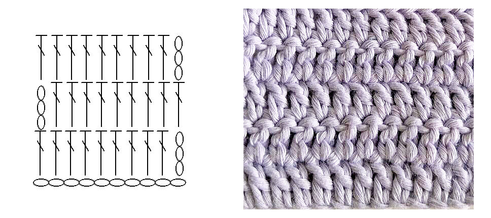 Сегодня разбираем столбик с накидом (ССН). Это один из базовых элементов вязания крючком, поэтому очень важно научиться делать его на автомате. Вот таким образом выглядит полотно из ССН и схема полотна. Начало вязания это цепочка из воздушных петель и 3 петли подъема. Начинаем вязать первый столбик пропусти 4 петли в цепочке из воздушных петель: 1. Накид на крючок 2. Вытягиваем петлю из цепочки (или полотна) 3. Снова накид на крючок, на крючке должно получится 4 петли. 4. Протягиваем 4-ю петлю через 3-ю и 2-ю, на крючке получается 2 петли. 5. Снова накид на крючок, на крючке 3 петли 6. Протягиваем последнюю петлю через остальные 2 петли. На крючке остается последняя петля с которой начинаем вязать следующий столбик. Столбики вяжутся в каждую петлю цепочки из воздушных петель. Для перехода на следующий ряд делаем 3 петли подъема. Если Вы свободно вяжите, можно и 2 петли сделать. Для вязания следующих рядов помните 2 момента: 1. В начале ряда петли подъема заменяют первый ССН, поэтому в