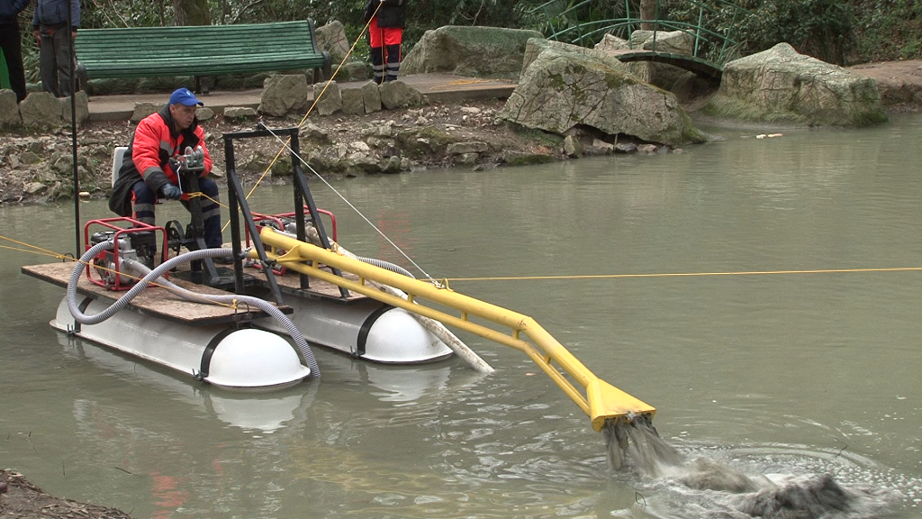 Впервые за это время пруд почистили не вручную, а с помощью специального оборудования. Для этого в парк прибыли специалисты «Водоканала». На дне пруда собралось огромное количество ила, который мешает обитающим здесь водоплавающим. Чисткой водоема не занимались 20 лет. Об этом во время осмотра парка в январе узнал глава Сочи и поручил провести работы по углублению пруда. Сегодня сотрудники сочинского «Водоканала» с помощью грунтового насоса избавили водоем от ила. Андрей Бондаренко, заместитель директора МУП «Водоканал» г. Сочи: «Данный портативный земснаряд при помощи подачи воды, ориентировочно 2-3 атмосферы, размывает заиленное. При помощи земснаряда, который успешно используется на территории водозабора нашего предприятия, мы имеем уникальную возможность очистить дно от илового осадка, что позволит его углубить и увеличить объем воды. Объем воды положительно влияет на жизнь этих маленьких, прекрасных существ. Чистота и качество этой воды после очистки позволит наблюдать их жизнь