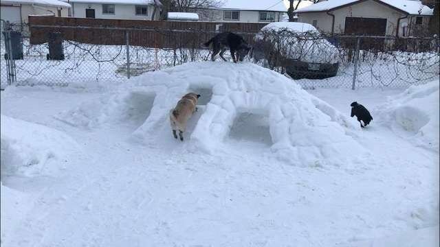 В Канаде житель города Виннипег Брайан Кейт Эйнарсон построил для своих собак зимний парк развлечений. Прямо на заднем дворе он соорудил настоящий дворец со снежными тоннелями, в котором его собаки проводят почти все свободное время. По словам мужчины, он старается поддерживать здоровье своих питомцев, хотя знает, что те предпочли бы весь день дремать дома. Чтобы мотивировать собак заниматься, Эйнарсон прячет внутри и снаружи туннелей полезные лакомства. Как только собаки видят вкусняшки, они тут же бегут к дворцу — и начинают их подъедать.