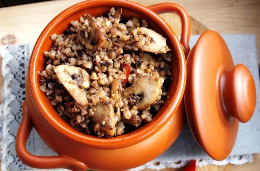 • соль, перец, тимьян Приготовление: Гречневую крупу отварить до полуготовности. Кабачок нарезать тонкой соломкой, морковь натереть на терке, томаты нарезать кубиком. Потушить овощи. На отдельной сковороде, смазанной каплей масла, обжарить грибы, нарезанные тонкими пластинами. После того как из грибов выпариться лишняя жидкость добавить к ним нарезанный полукольцами лук. Обжарить до золотистого цвета. Соединить овощи, лук с грибами и гречку. Добавить соль, перец, тимьян. Перемешать. Уложить все в горшочки, добавить немного воды и томить до готовности в духовке при 200 градусов. Приятного аппетита!!!