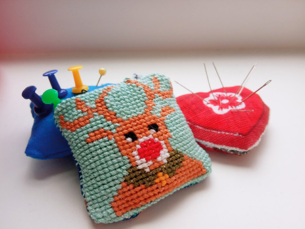 В этой статье я расскажу о идеях декорирования маленьких подушечек. Я думаю как делать подушки вы знаете, берём 2 кусочка ткани, нитки, иголку и ножницы. В моём случаем, второй кусочек который я буду сшивать-канва, с вышитой на ней рисунком. Рисунок может быть любой и не только крестиком, это вы сами как решите. Получается вот такое чудо, отлично подойдёт под новогоднюю тематику) Следующую подушечку я сшиваю обычными кусочками ткани Я смогла найти именно такую, что бы подушечка у меня была в виде сердечка. Я уверена в ваших запах найдётся что то подобное. Необязательно сердечко, это может быть и кругловидной формы и треуголной, главное чтоб вам нравилось Такое сердечко у меня получилось, на самой первой фотографии вы видели что я использовала её как игольницу. Можно не останавливаться на маленьких подушечках и начать шить большие, можно так же использовать вышифку, бисер(при условии что вы не будете спать на ней) или просто красивый материал. Главное заранее купить чем вы будете её з