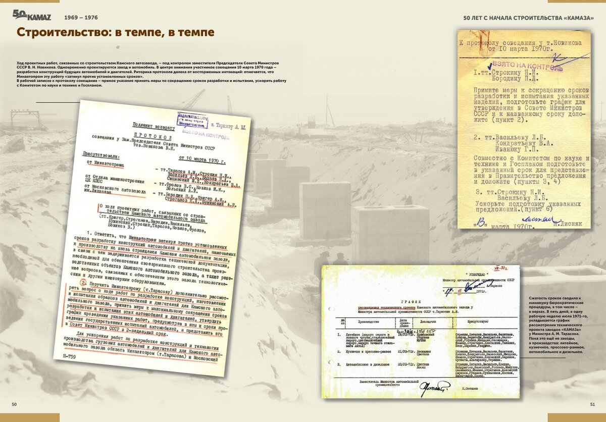 Несмотря на то, что темпы строительства комплекса заводов «КАМАЗ» были небывалыми, всё же они поначалу отставали от запланированных. Ход проектных работ, связанных со строительством Камского автозавода, – под контролем заместителя Председателя Совета Министров СССР В. Н. Новикова. Одновременно проектируются завод и автомобиль. В центре внимания участников совещания 10 марта 1970 года – разработка конструкций будущих автомобилей и двигателей. Риторика протокола далека от восторженных интонаций: отмечается, что Минавтопром эту работу «затянул против установленных сроков». В рабочей записке к протоколу совещания – прямое указание принять меры по сокращению сроков разработки и испытания, ускорить работу с Комитетом по науке и технике и Госпланом. Сжатость сроков сводила к минимуму бюрократические процедуры, в том числе – в верхах. В пять дней, в одну рабочую неделю июля 1971-го, укладывается график рассмотрения технического проекта заводов «КАМАЗа» у Министра А. М. Тарасова. Пока это ещё