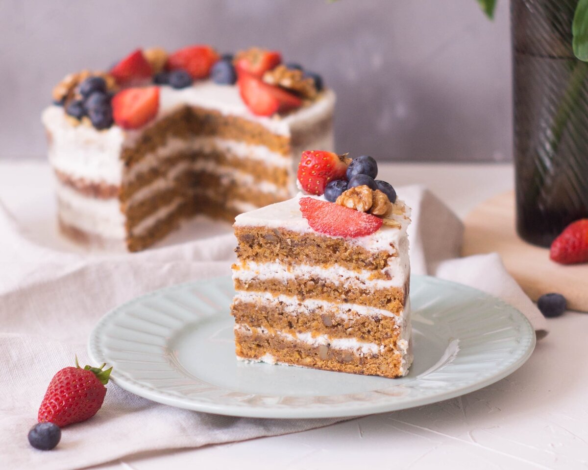 Воздушный пирог на основе меда и апельсина с курагой, финиками и орешками.