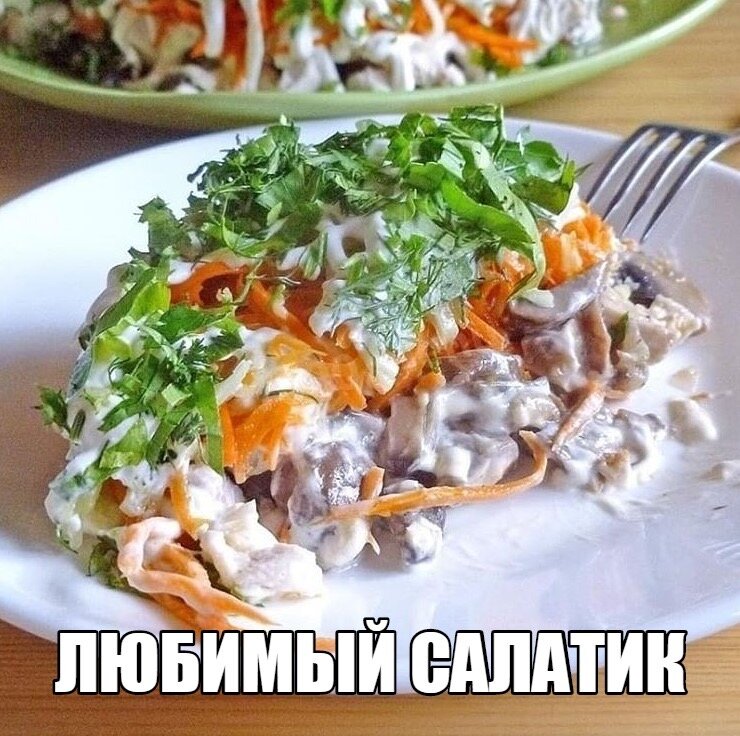 ДЕВОЧКИ, ТЕПЕРЬ У МЕНЯ НОВЫЙ ЛЮБИМЫЙ САЛАТИК! Он нежный и вкусный, а какой сочный! Обязательно попробуйте! Нам потребуется: Шампиньоны 300 г Лук репчатый 200 г Куриное филе 500 г Корейская морковь 150 г Огурцы 150 г Зелень 30 г Растительное масло 2 ст. л. Поваренная соль 0.5 ч. л. Майонез 200 г Приготовление: Куриную грудку отвариваем до готовности, при варке можно добавить лавровый лист и слегка подсолить. Времени на варку уйдет примерно 50 минут. Шампиньоны моем и нарезаем небольшими пластинками. Лук чистим и нарезаем четверть-кольцами. Нарезанные лук и грибы помещаем в сковородку, налив в нее растительное масло. Жарим грибы с луком сначала на сильном огне минут пять, затем немного солим, перемешиваем и уменьшаем огонь. Сковородку накрываем крышкой и готовим шампиньоны еще в течение 10 минут. Через 10 минут огонь под сковородкой выключаем и даем жареным грибам немного остыть. Огурцы чистим от кожицы и трем на терке мелкой соломкой, как морковку по-корейски. Отвар