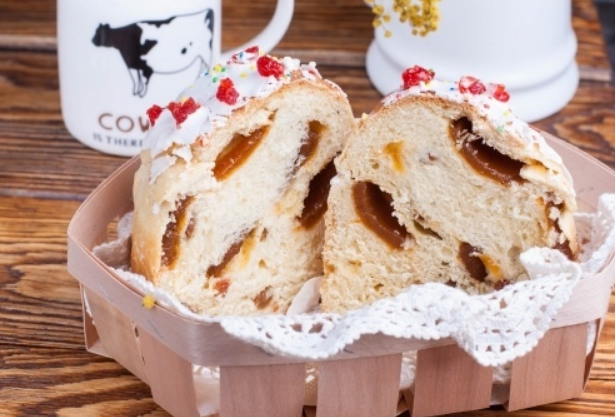 Ингредиенты: -Повидло – 250 г. -Мука – 550 г. -Соль – щепотка (-и) -Сахар – 5 ст.л. -Ванильный сахар – 1 упаковка. -Дрожжи – 2.5 ч.л. -Масло сливочное – 150 г. -Яйцо – 2 шт. -Молоко – 200 мл Приготовление: Я использую густое повидло, которое продается в магазине в виде брикетов. Но если такое повидло найти не удалось, то можно использовать мармелад. Сложить все ингредиенты в чашу хлебопечки в последовательности, указанной в инструкции (отложите 1-2 ложки муки на подпыл). В моей хлебопечке сначала это дрожжи, мука, сахар, ванильный сахар и соль, а затем влажные ингредиенты. Установить программу "тесто". Если по сигналу вы видите, что тесто подошло не достаточно, то выключите хлебопечь, закройте крышку и дайте постоять еще минут 15. Аппарат все равно хранит тепло, поэтому тесто дойдет до нужного состояния. Разделить тесто на столько частей, сколько куличей вы хотите из него получить. У меня это три небольших кулича. Раскатать на припыленной мукой поверхности пласт тес