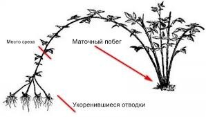 Для увеличения выхода саженцев на боковом побеге под почками делают легкие насечки бритвой и укладывают его, не отрезая от материнского куста, в бороздку с рыхлой влажной почвой. К осени следующего года из почек вырастают побеги и укореняются. Стебель аккуратно выкапывают и разделяют на отдельные саженцы, стараясь не стряхивать почву с корней. При небрежной выкопке нежные корни обрываются и саженцы плохо приживаются на новом месте.