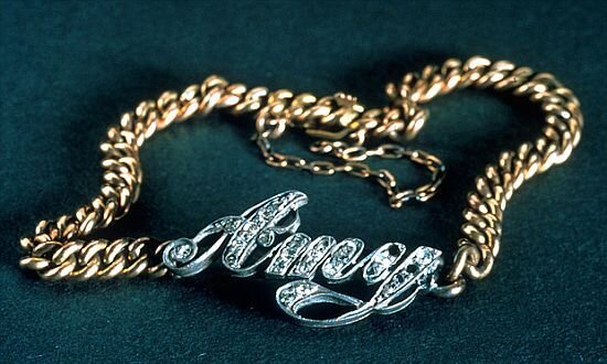 Одним из самых загадочных предметов найденных на затонувшем лайнере является золотой браслет с надписью «Эми» (“Amy”). Браслет был найден после кораблекрушения и продан с аукциона спустя примерно сто лет после катастрофы. Найденный на «Титанике» браслет выглядит как золотая цепочка с элементами серебра и бриллиантами. Собственно, сама надпись выложена именно бриллиантами. Надпись «Эми» на браслете указывает на то, что его владелицей могла быть Аманда, которая была членом экипажа. Также это украшение могло принадлежать двум другим девушкам – пассажирам второго класса: мисс Аманде или Амели. Помимо этого существует версия, что браслет везли кому-то в подарок. Так или иначе подлинный владелец этого ювелирного украшения неизвестен, как неизвестна и его судьба. Стоит отметить, что этот браслет является далеко не единственным драгоценным украшением поднятым со дна Атлантического океана. На «Титанике» было очень много различных ювелирных изделий из золота и бриллиантов. Общая стоимость украшений, которые перевозил лайнер оценивается минимум в 200 миллионов долларов по сегодняшним меркам. Учитывая, что исследование одна до сих пор продолжается, не исключено, что вскоре общая стоимость сокровищ «Титаника» немного возрастет.