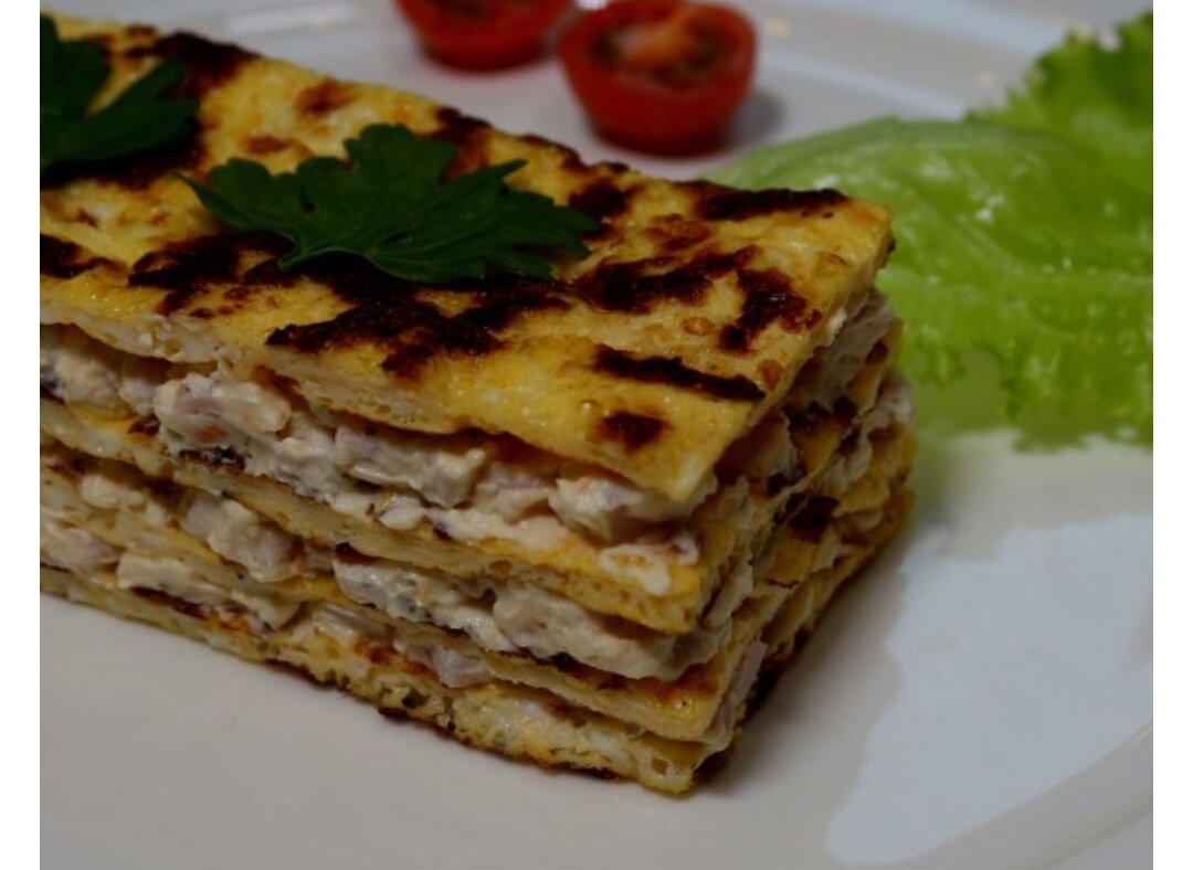 ИНГРЕДИЕНТЫ ПРИГОТОВЛЕНИЯ В емкости смешиваем сливочный сыр и нарезанный мелкими кубиками карбонат. В глубокую миску вбиваем яйца, вливаем молоко, добавляем соль по вкусу. Смешиваем ингредиенты с помощью венчика. На сковороду кладем кусочек сливочного масла и ставим разогреваться. Затем вливаем яичную массу на уже разогретую сковороду и жарим омлет. Далее яичный омлет выкладываем на деревянную доску и нарезаем таким образом, чтобы получилось несколько небольших прямоугольников. Далее на тарелку выкладываем кусочки омлета, чередуя их с начинкой из сливочного сыра и ветчины.