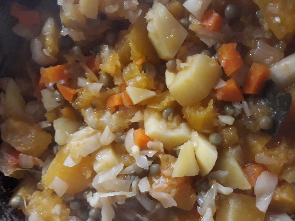 В тему поста или вегетарианского образа жизни. Или гарнира для мясоедов. Подготовить овощи, которые мы будем укладывать в кастрюлю с небольшим количеством масла на дне Тонко шинкуем капусту( она будет первая, т.к.немного дольше готовится) Режем крупными кубиками 3-4 картофелины Укладываем в кастрюлю Не мелко шинкуем морковь и лук Режем кубиками кабачки Мой кабачок был прошлогодний- завалявшийся, поэтому немного полежал в подсоленой воде, чтобы избежать горького привкуса Укладываем следующие слои В оригинальном рецепте далее должен быть слой свежих помидорок, но, у меня их не было, поэтому- томатный соус и немного рубленого чеснока Солью посыпаем сверху Выливаем банку зеленого горошка вместе с рассолом Добавляем воды( льем так, чтобы соль просочилась вниз тоже) столько, чтобы наклонив кастрюлю жидкость была видна Втыкаем один лавровый лист переломленый пополам и несколько горошин перца. Закрываем крышкой, не перемешивая и тушим на среднем огне 45 минут. По окончании тушения перемешать.