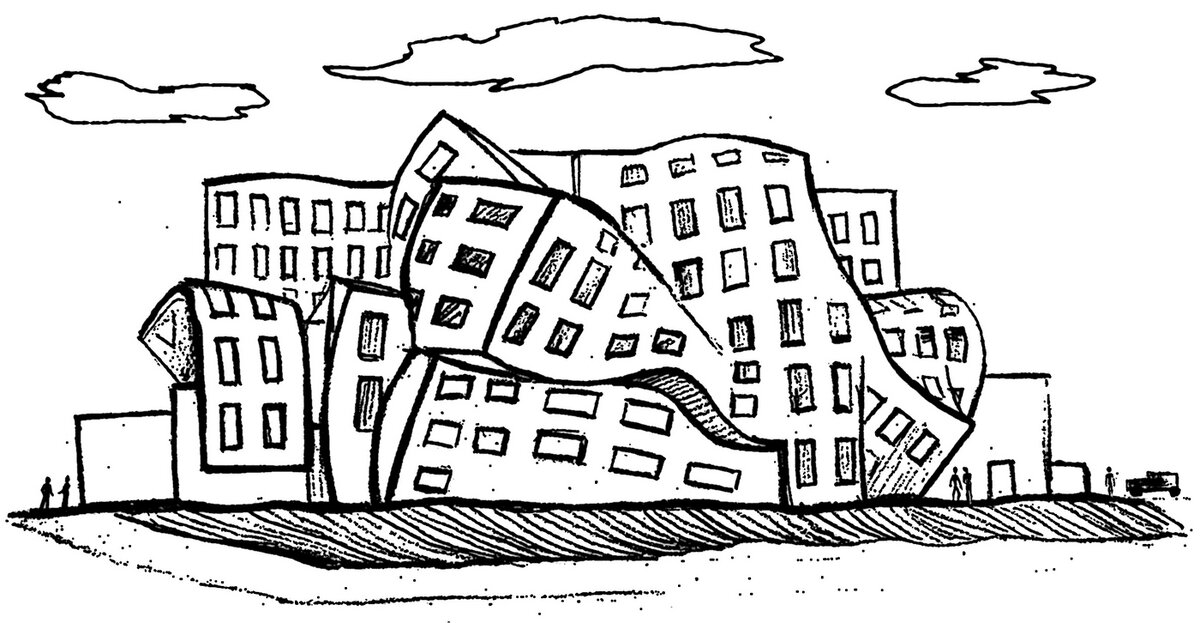 Другое университетское здание его же работы – «дом Петера Льюиса» – производило впечатление взорванного изнутри, а затем изрядно раскуроченного ураганом. Оба шедевра современной архитектуры были обойдены нами со всех сторон. Внутри у Сергея были дела, так что мы с Таней совершили вояж и там, в замысловатых модернистских интерьерах. Ровных стен в них практически не было: где-то они изгибались и переламывались, где-то состыковывались под разными углами. Жилось-работалось там, видимо, непросто.